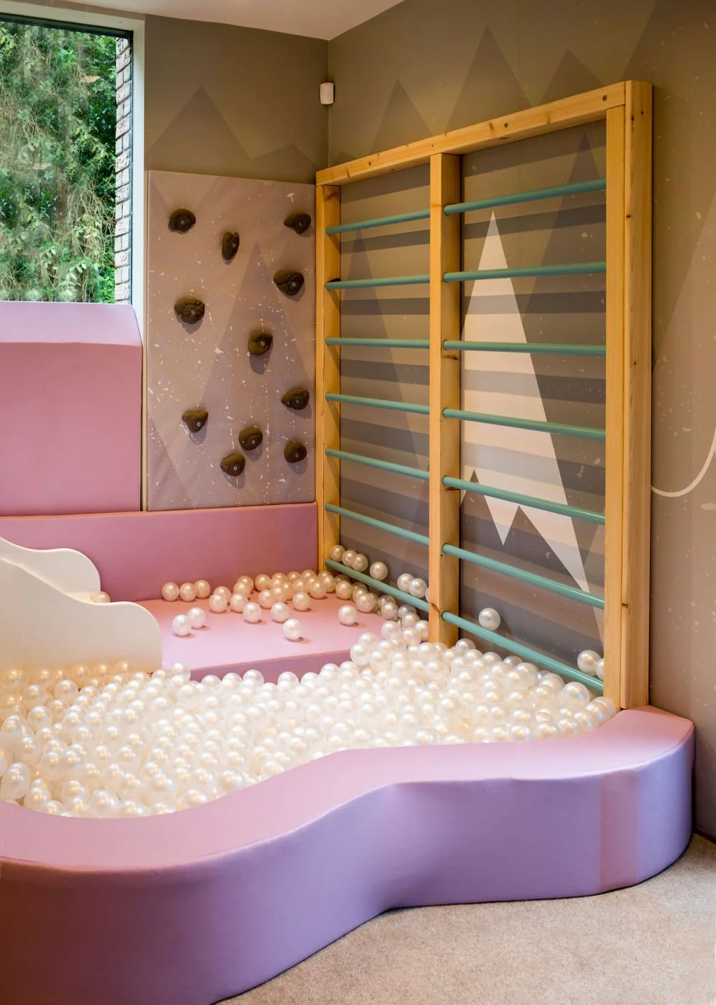 The play space includes a role play kitchen, climbing wall, basketball hoop, football net with LED insert, bespoke carpet, ball pool, slide and play frame.