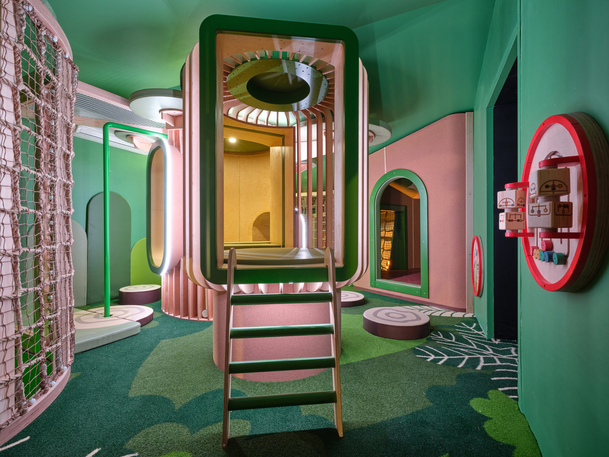 To deepen the sense of immersion, the space features bespoke printed flooring that mimics woodland textures, complemented by sensory lighting that shifts the atmosphere from bright and playful to soft and magical. Every fun feature was carefully considered to spark curiosity and wonder at every turn.